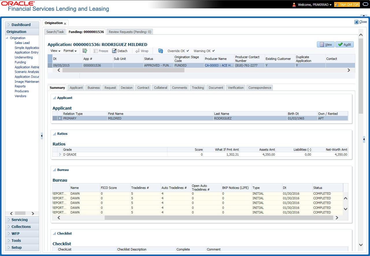 At this stage of the Line of credit origination process, the application has been entered into Oracle Financial Services Lending and Leasing and approved manually by an underwriter or by the system. The next step is to view and complete the contract information and make a funding decision to finance or reject the application. This is accomplished by using the Funding screen.
