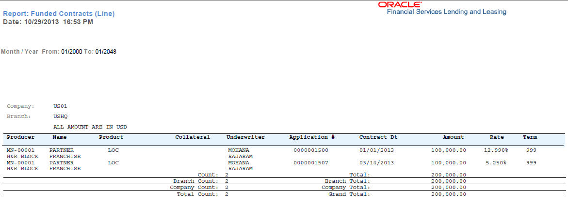 Example of the Funded Contracts Line report