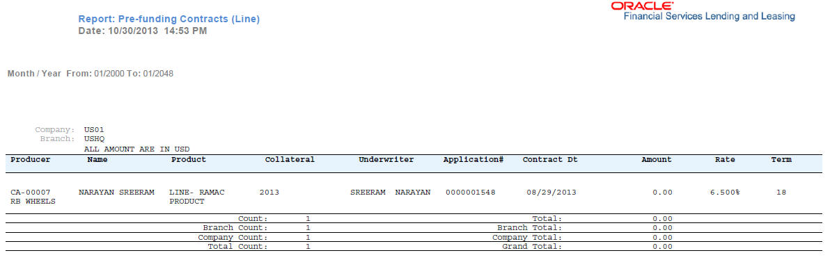 Example of the Pre Funding Contracts Line report