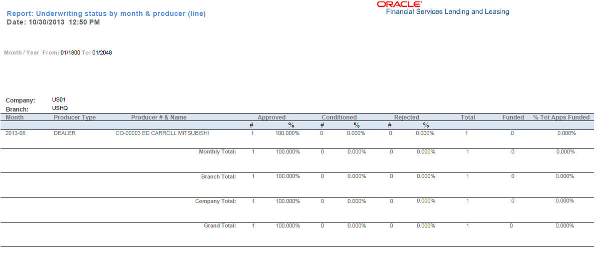This underwriting report lists application status by month and producer for lines of credit.