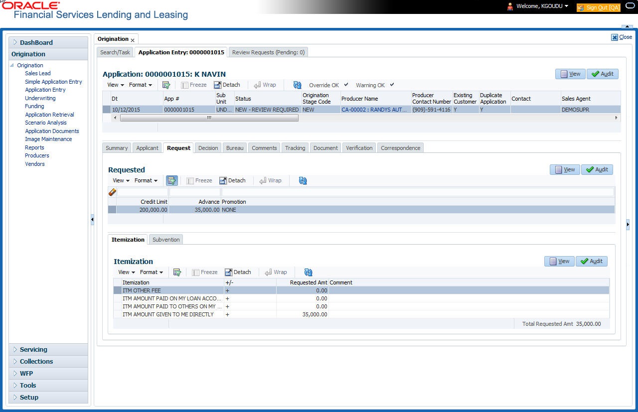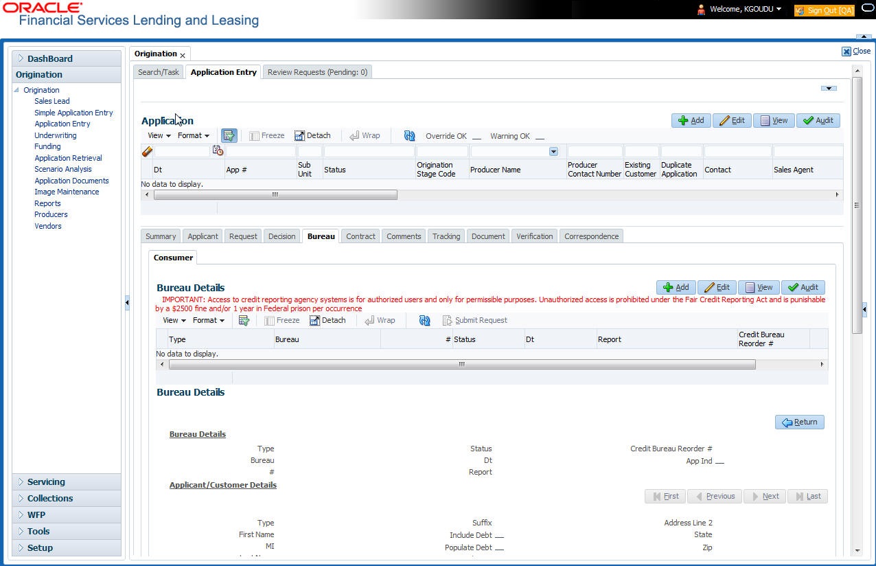 The first step in the Loan origination process is entering credit application data into Oracle Financial Services Lending and Leasing Application. The Application Entry screen enables you to specify information from credit application into the system and request a credit bureau report.