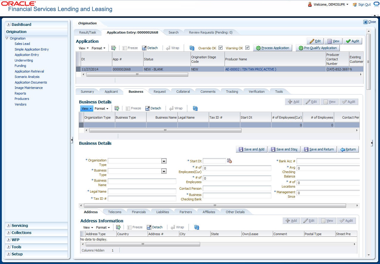 Oracle Financial Services Lending and Leasing can record SME business related financial information and business partners on the Business screen to assist in approving the Loan application during underwriting. The Business Applicant screen is available for Loan and contains the following sub screens: