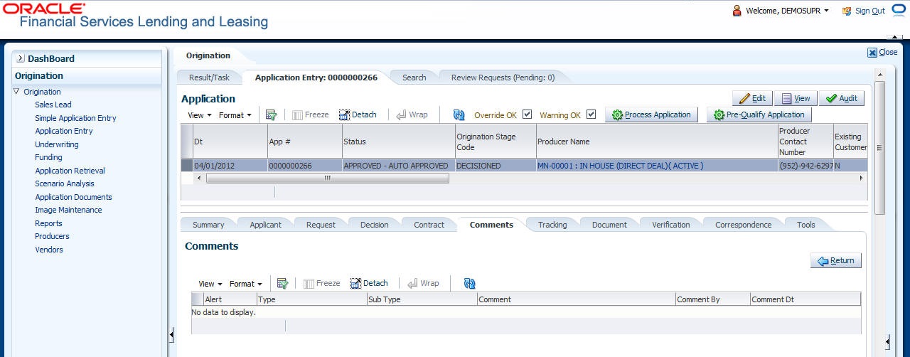 When finished, Oracle Financial Services Lending and Leasing checks the application for completeness using a predefined set of edits. These edits search for errors and warnings based on your system setup. Status change of the application can be determined by credit bureau and scoring model of the application. The prescreening checks ensure that automatic credit bureau reports are pulled only for applications which meet set criteria, thus saving cost.