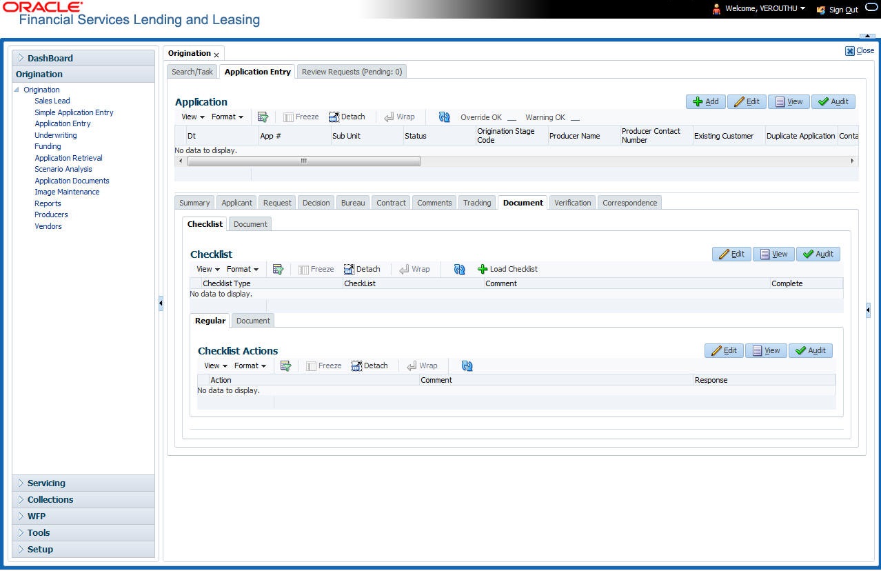 Oracle Financial Services Lending and Leasing can be configured to automatically validate portions of an application when you attempt to change its status. The results of this data check appear on the Verification link’s Edit screen as an Error, a Warning or an Override.