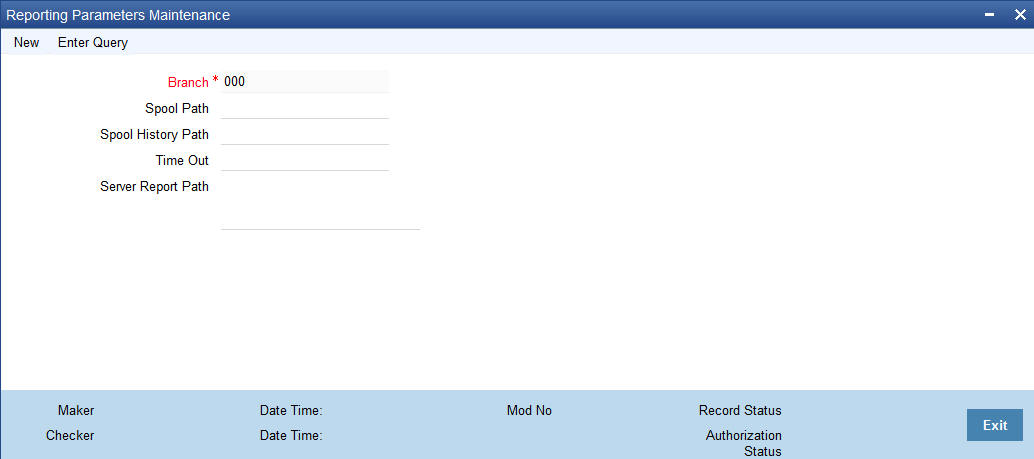 You can maintain a location to spool the reports for a specific branch using ‘Reporting System – Parameters’ screen. You can invoke this screen by typing ‘RPDRPRAM’ in the field at the top right corner of the Application tool bar and clicking on the adjoining arrow button.