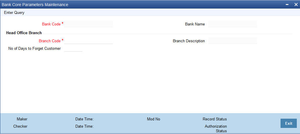 You can invoke ‘Bank Core Parameters Maintenance’ screen by typing ‘STDCRBNK’ in the field at the top right corner of the Application tool bar and clicking on the adjoining arrow button.