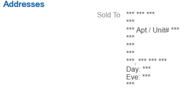 Any of the following information on the customer placing the order, if it is passed in the submit order message: • first name, middle initial, last name • company name • first through fourth address lines, including any apartment or suite • city, state, Postal Code, and country • first phone number (prefixed by Day:) • second phone number (prefixed by Eve:) • email address Customer anonymized? If the customer data on an order has been anonymized, asterisks are displayed for the sold-to information. See Anonymizing Data for background.. |