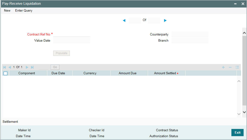 You can invoke the ‘Pay - Receive Liquidation’ screen by typing ‘OLDPRLIQ’ in the field at the top right corner of the Application tool bar and clicking the adjoining arrow button.