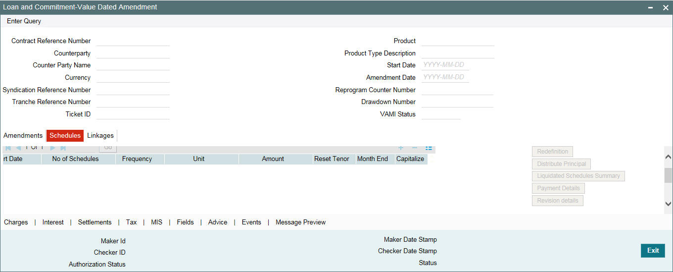 If there is any principal amount increase or maturity date change in the contract, you can distribute the amount equally among all the schedules and redefine the schedules from the amendment date till maturity date. You can do this using 'Distribute Principal' and 'Redefinition' button in 'Schedules' tab of 'Loan and Commitment Value Dated' screen.