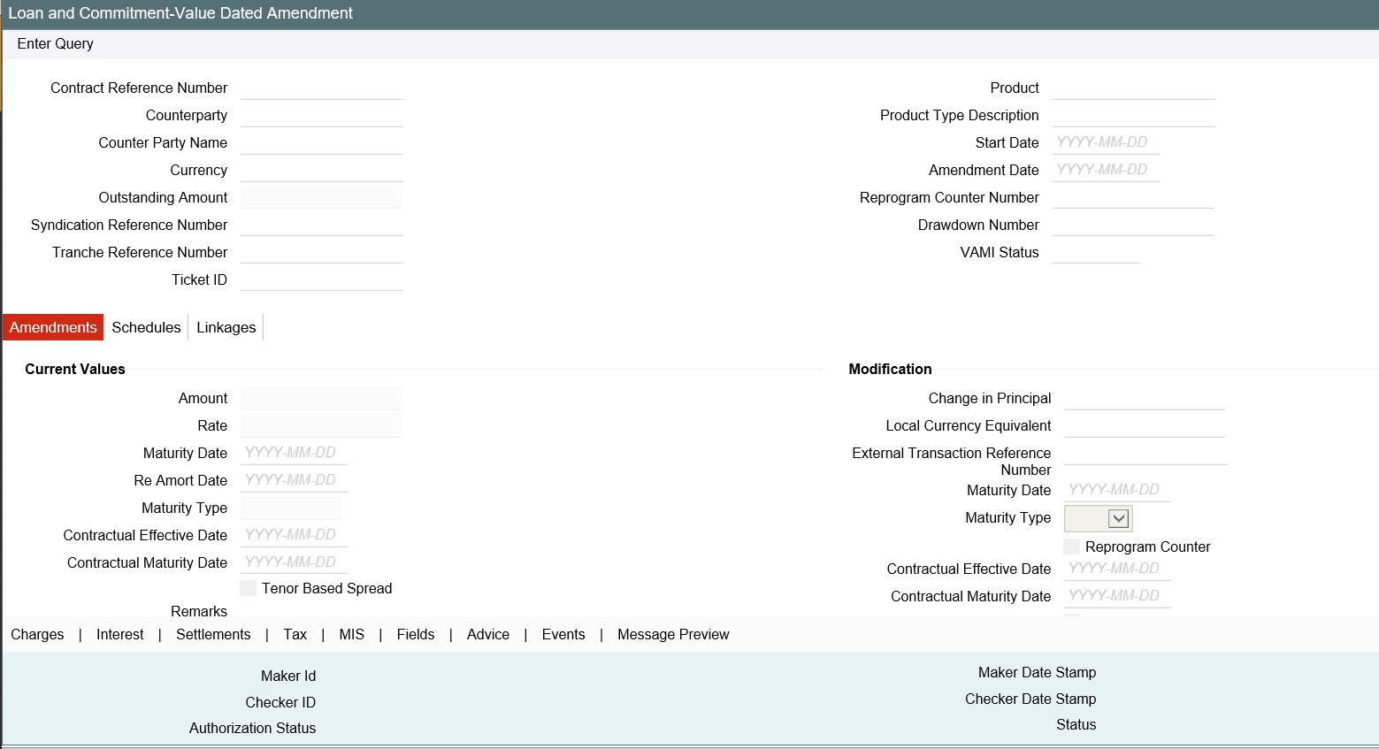 Based on the value of ‘Special Rate Type’, system either enables ‘Rate’, ‘Interest Amount’ for amendment. The amended value is applicable only to future schedules where late payment charges are to be calculated. Thus back/future value dated change is not allowed for late payment charge components.