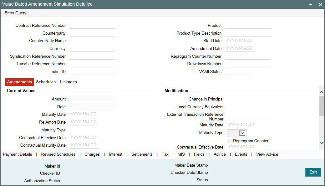 The value dated amendment simulation screen is similar to ‘Loan and Commitment - Value Dated Amendment’ screen. Once the VAMI is saved in this screen, you can view the revised schedules and view the advice.