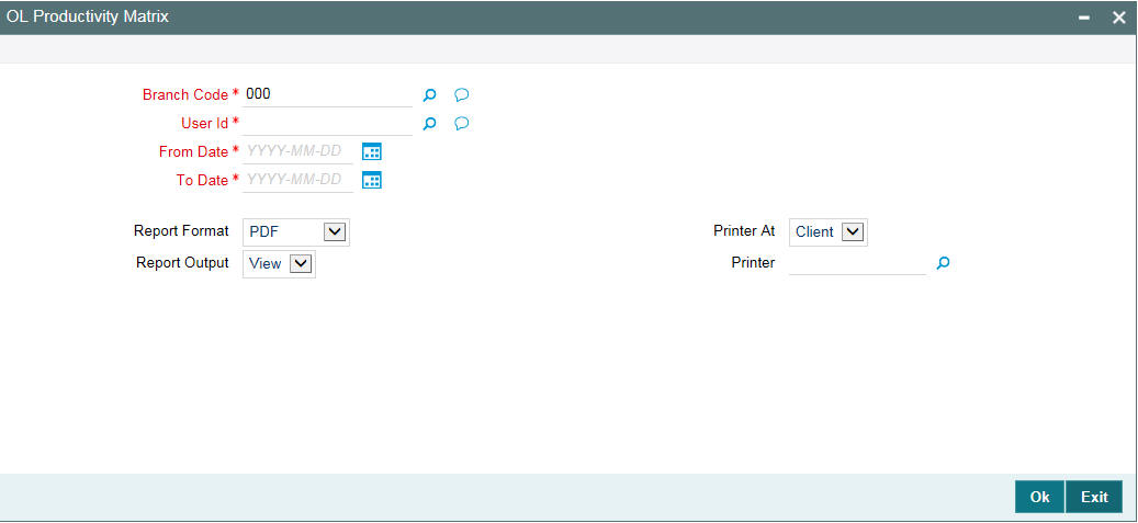 You can invoke the ‘OL Productivity Matrix Report’ screen by typing ‘OLRFRPMX’ in the field at the top right corner of the Application tool bar and clicking the adjoining arrow button.