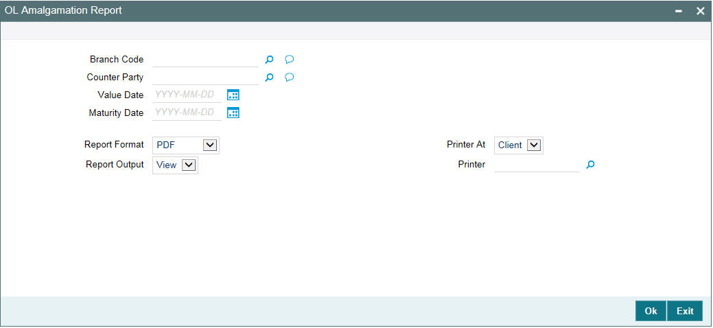 You can invoke the ‘OL Amalgamation Report’ screen by typing ‘OLRNAMRT’ in the field at the top right corner of the Application tool bar and clicking the adjoining arrow button.
