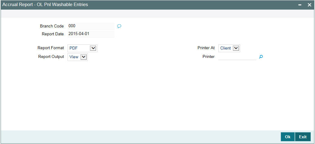 You can invoke the ‘Accrual Report -OL PNL Washable Entries’ screen by typing ‘OLRPACPN’ in the field at the top right corner of the Application tool bar and clicking the adjoining arrow button.