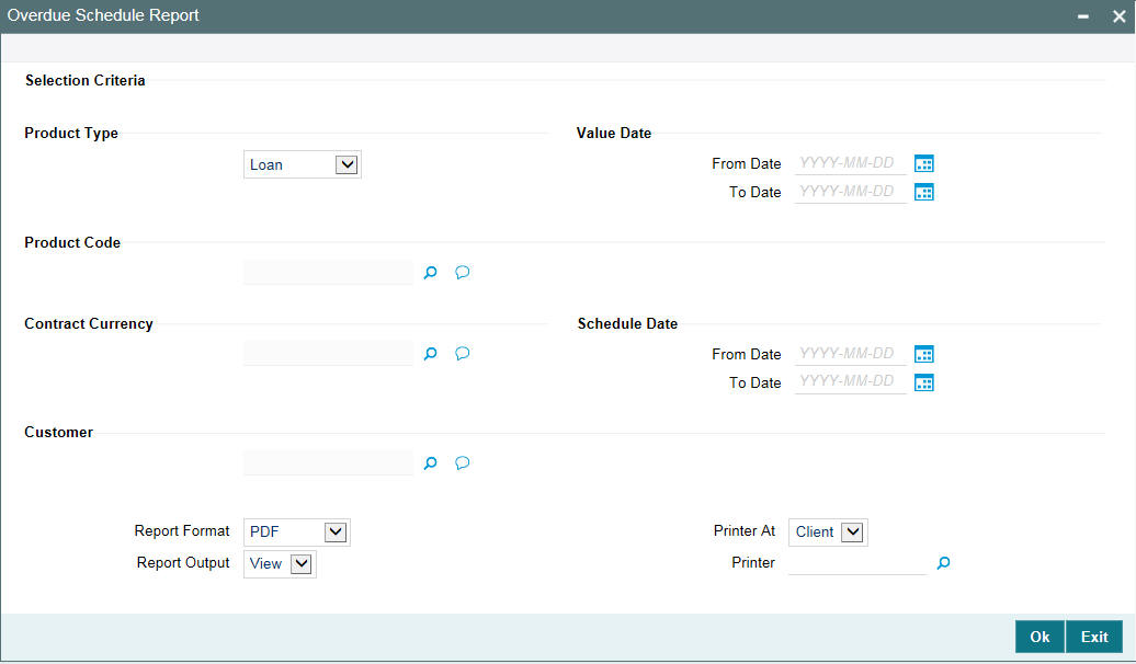 You can invoke the ‘Overdue Schedule’ screen by typing ‘OLRPOSCH’ in the field at the top right corner of the Application tool bar and clicking the adjoining arrow button.