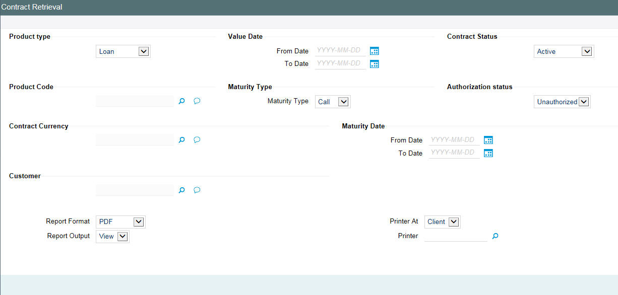 You can invoke the ‘Contract Retrieval’ screen by typing ‘OLRPRETR’ in the field at the top right corner of the Application tool bar and clicking the adjoining arrow button.