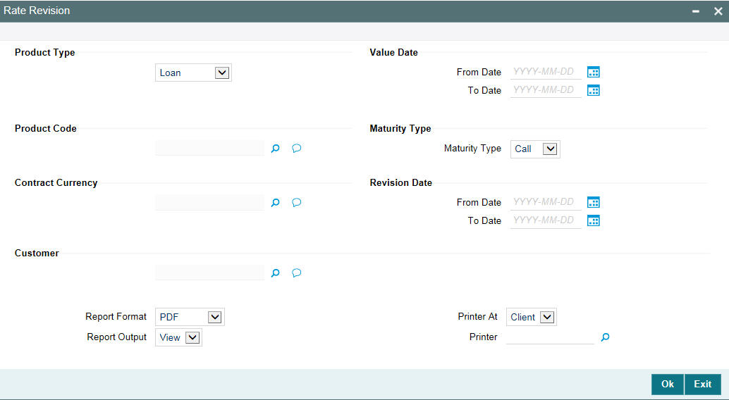 You can invoke the ‘Rate Revision’ screen by typing ‘OLRPREVN’ in the field at the top right corner of the Application tool bar and clicking the adjoining arrow button.