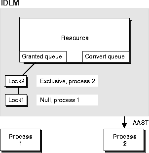 In Figure 8-2, the IDLM sends a blocking AST to Process 1, the owner of the shared lock, notifying it that a request for an exclusive lock is waiting. When the shared lock is relinquished by Process 1, it is converted to a null mode lock or released.