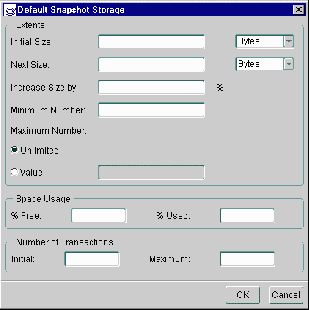 Use a storage clause: Allows user to define custom storage settings for the generated snapshots. If enabled, you can modify the extents, space usage, and number of transaction settings. Press the Edit button to modify these settings and see "Using a Storage Clause" on page for detailed information.