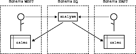 references the database link below. No matter who calls the routine, it connects to the Chicago database as user scott