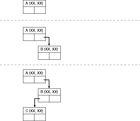 In this structure, each node is a datatype with fields for information, the two co-ordinates, a left-link and a right-link which can point to two children.