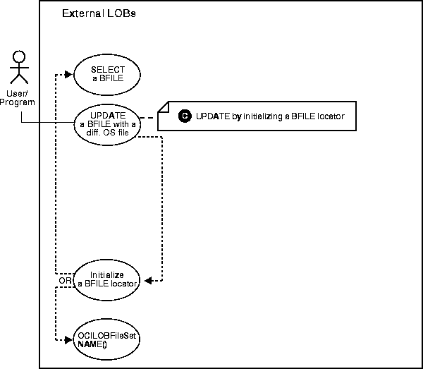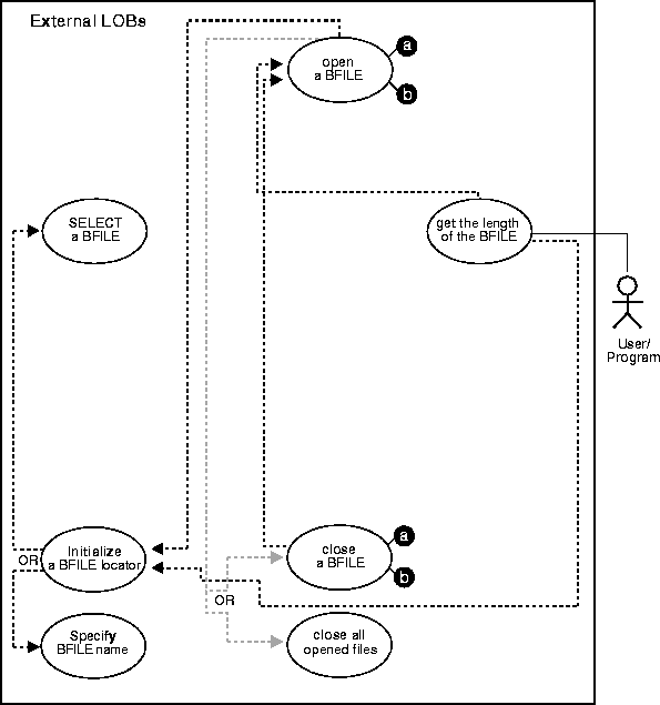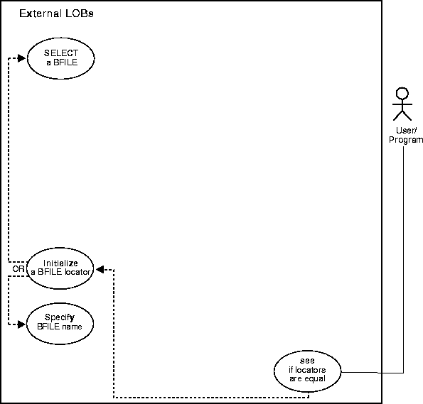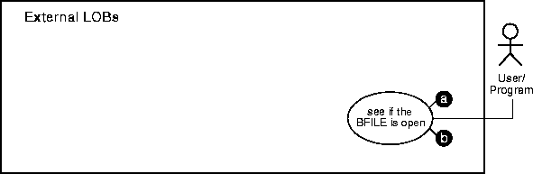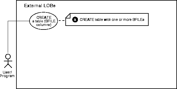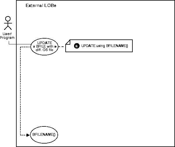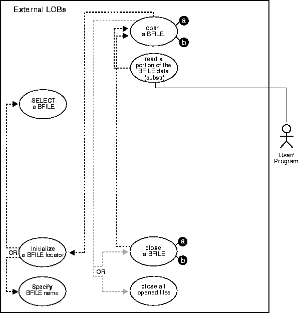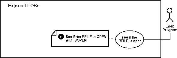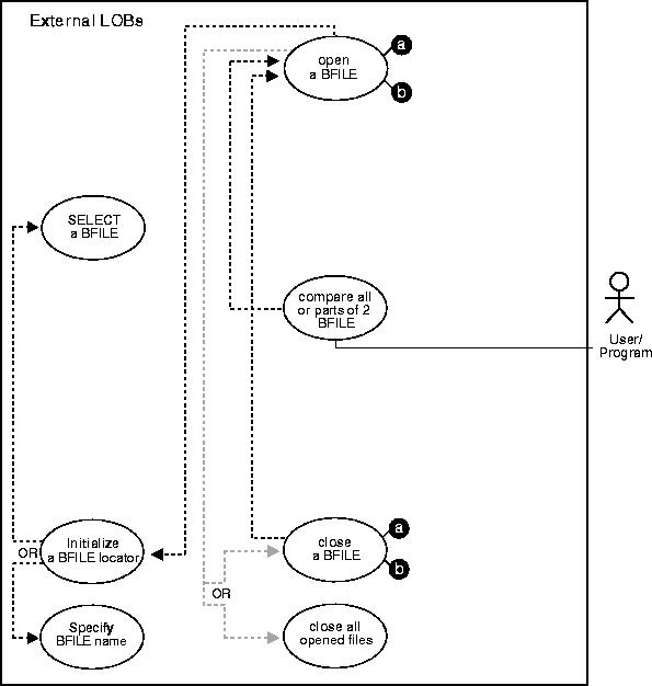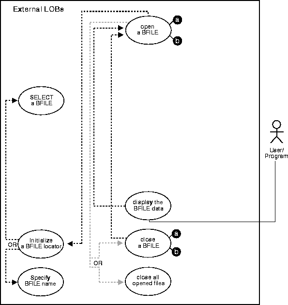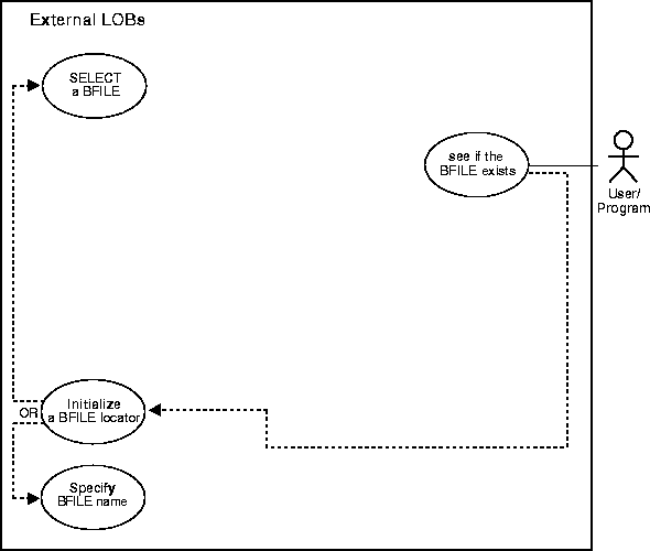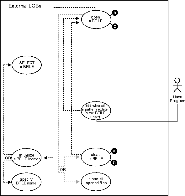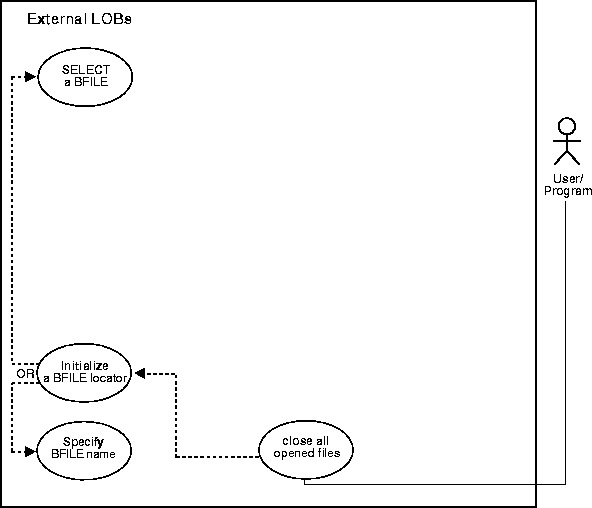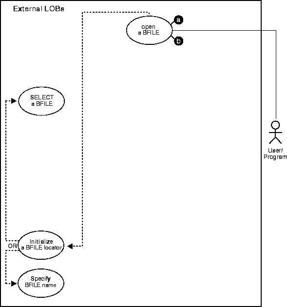 is Open") in terms of a use case by that name. The table listing all the use cases is provided at the head of the chapter (see "Use Case Model: External LOBs"). A summary figure, "Use Case Model Diagram: External LOBs", locates all the use cases in single drawing. If you are using the HTML version of this document, you can use this figure to navigate to the use case in which you are interested by clicking on the relevant use case title.