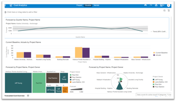 Description: The Forecasted Cost Overview dashboard enables Executives and PMOs to track cost forecasts for individual projects on a quarterly basis. They can compare costs between baseline, actuals and forecasts by project name and owner. They can then make informed decisions about which projects or owners have the highest cost variance.