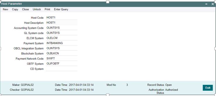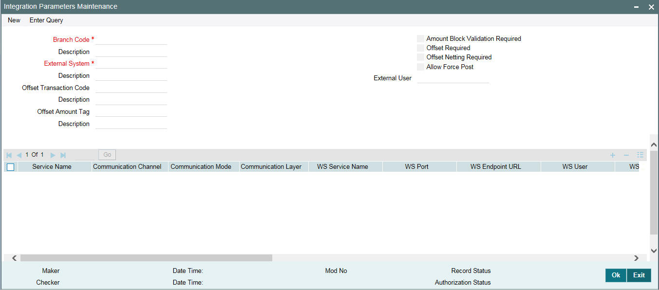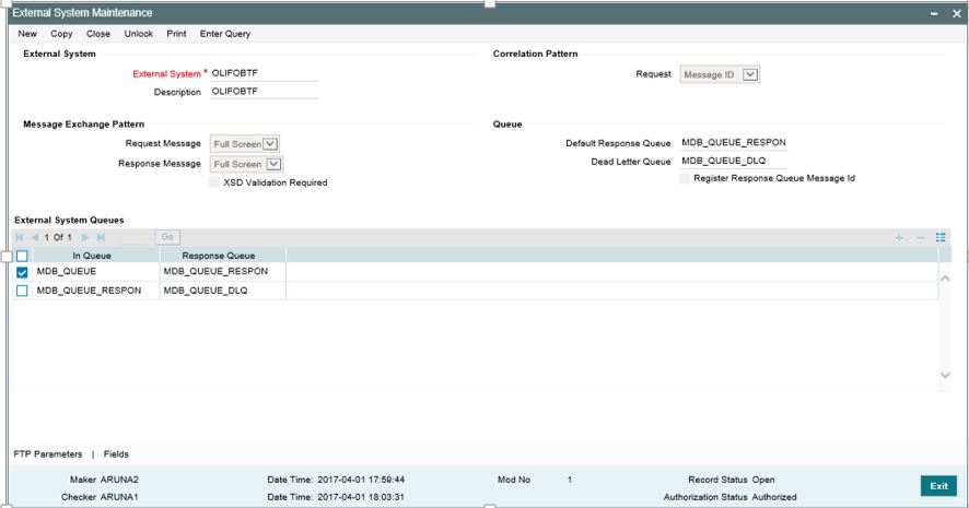 Ensure you maintain an active record with all required fields and Service Name as “OBTFIFService” in ‘Integration Parameters Maintenance’ screen