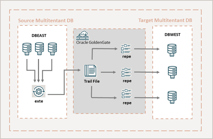 複数のソース・プラガブル・データベースから複数のターゲット・プラガブル・データベースへのレプリケーションを構成するには、パラレルExtractおよびReplicatストリームを構成し、それぞれ1つのプラガブル・データベースのデータを処理できます。または、複数のソース・プラガブル・データベースから1つのExtractキャプチャを構成できます(複数のReplicatグループによって読み取られる1つの証跡を書き込み、それぞれ異なるターゲット・プラガブル・データベースに適用します)。さらに別の方法として、複数の証跡への1つのExtract書込みを使用する方法があり、各証跡は、特定のターゲット・プラガブル・データベースに割り当てられたReplicatによって読み取られます。
