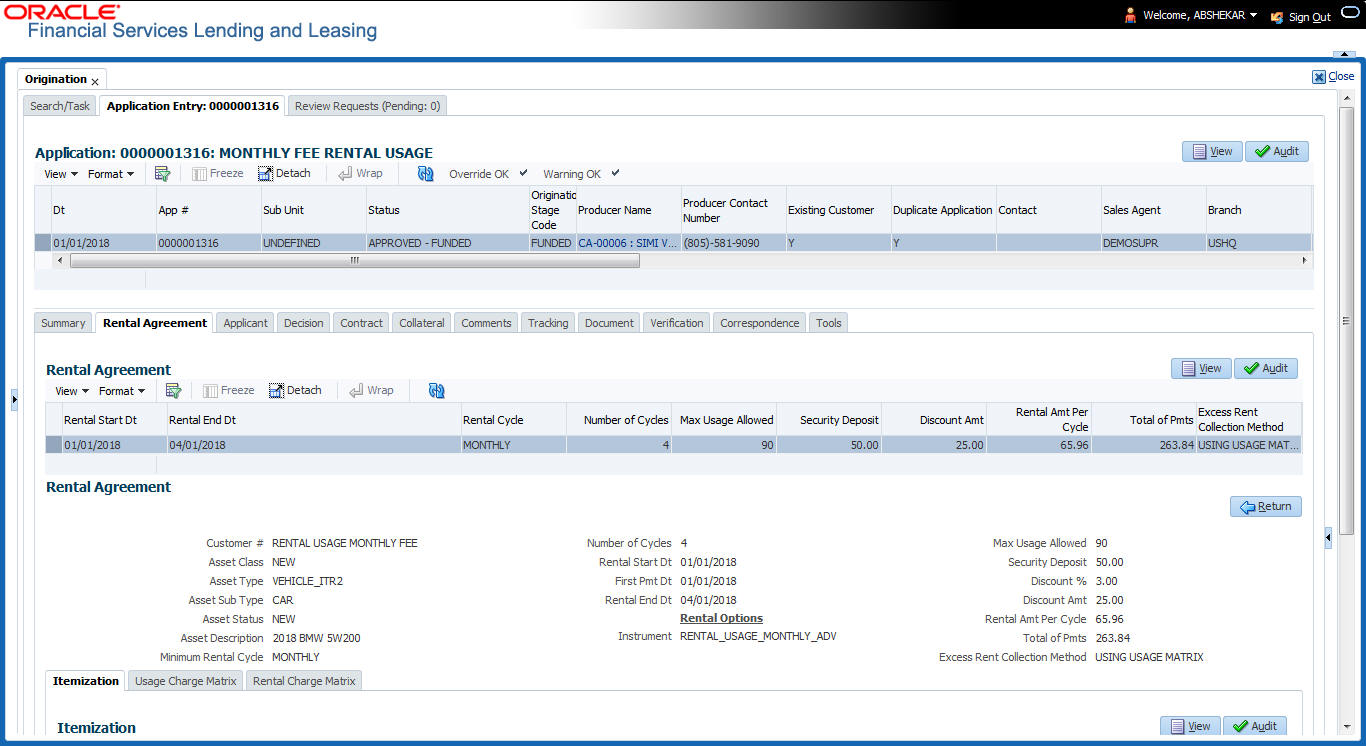 The Rental Agreement screen is a hybrid screen in Origination module which facilitates to capture and process most of the required action for funding rental based leasing contracts instead of navigating through multiple tabs.