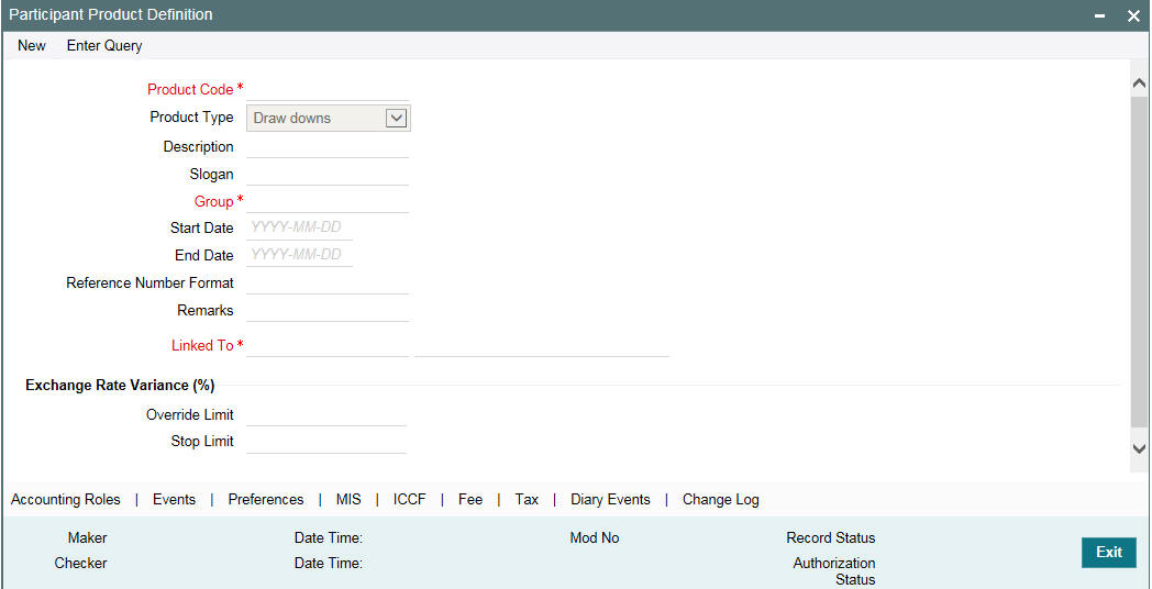 You can define the generic attributes specific to a borrower tranche/drawdown product in the ‘Loans Syndication – Borrower Product Definition’ screen.