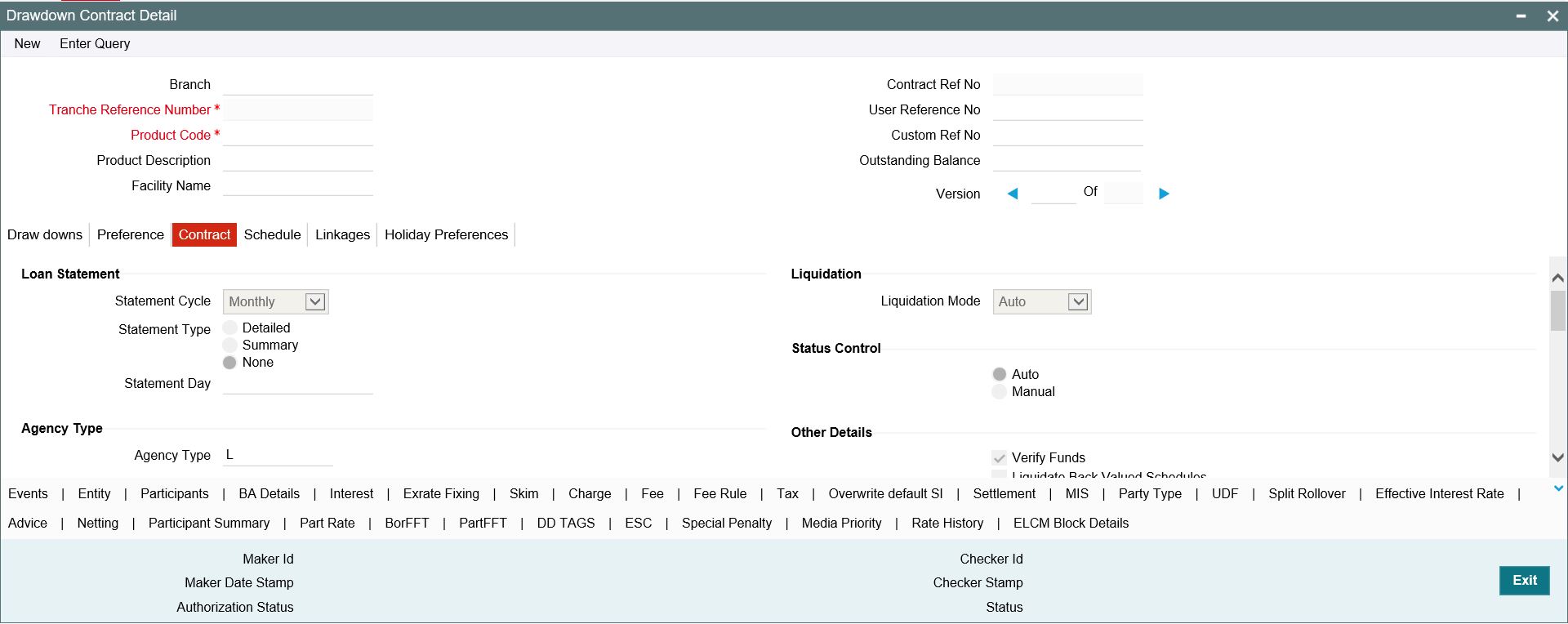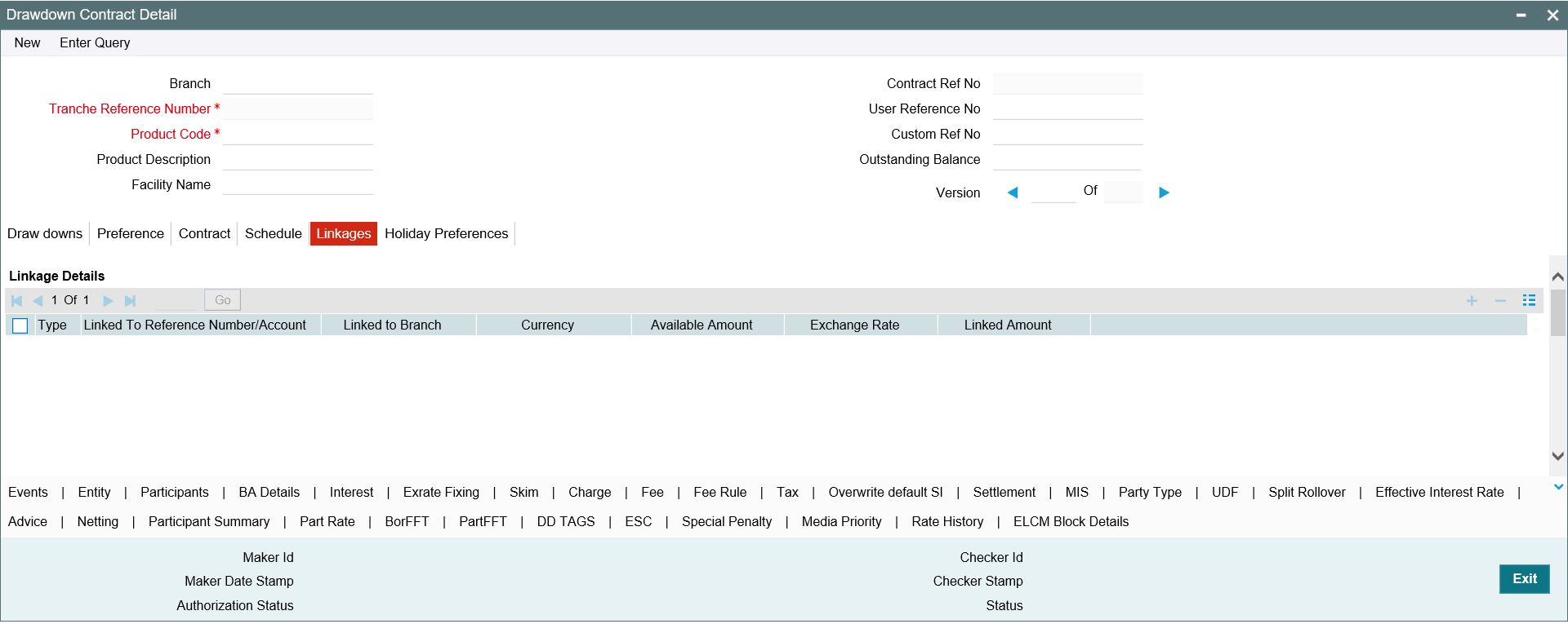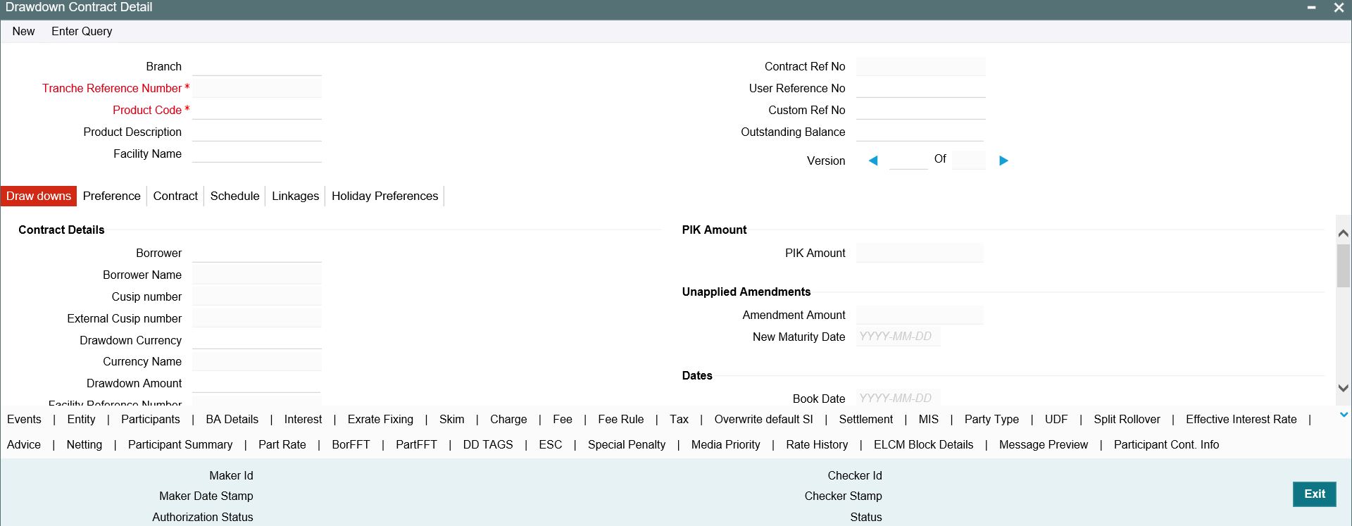 You capture information pertaining to the drawdown in the following tabs of the screen: