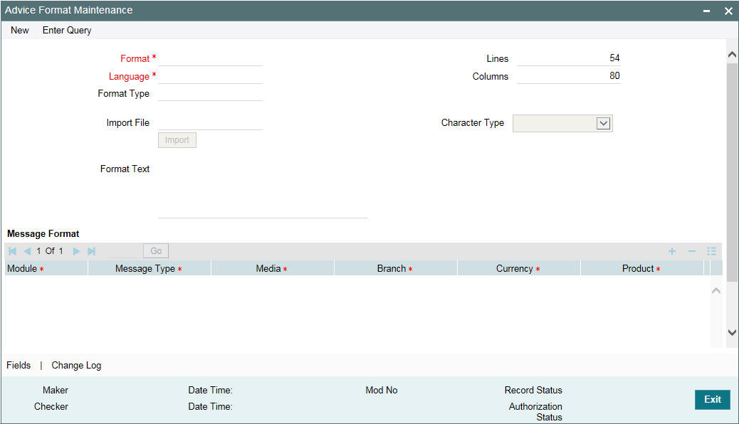 The advices that are generated from your bank will have a definite format. In the advice format maintenance screen you can specify formats and indicate the messages and advices that should use the formats you have defined.