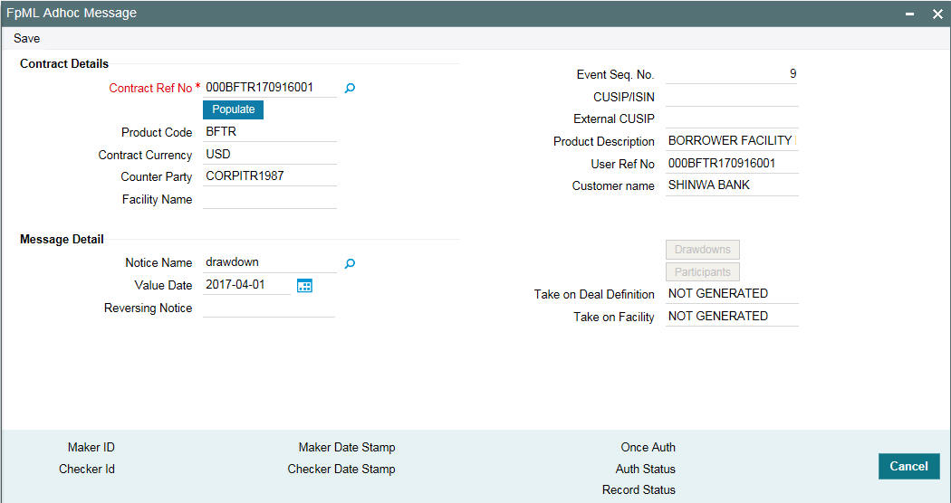 You can select the drawdowns corresponding to the tranche using ‘Drawdown Selection’ screen. You can invoke this screen by clicking the ‘Drawdown’ button in the ‘Fpml Adhoc Message’ screen.