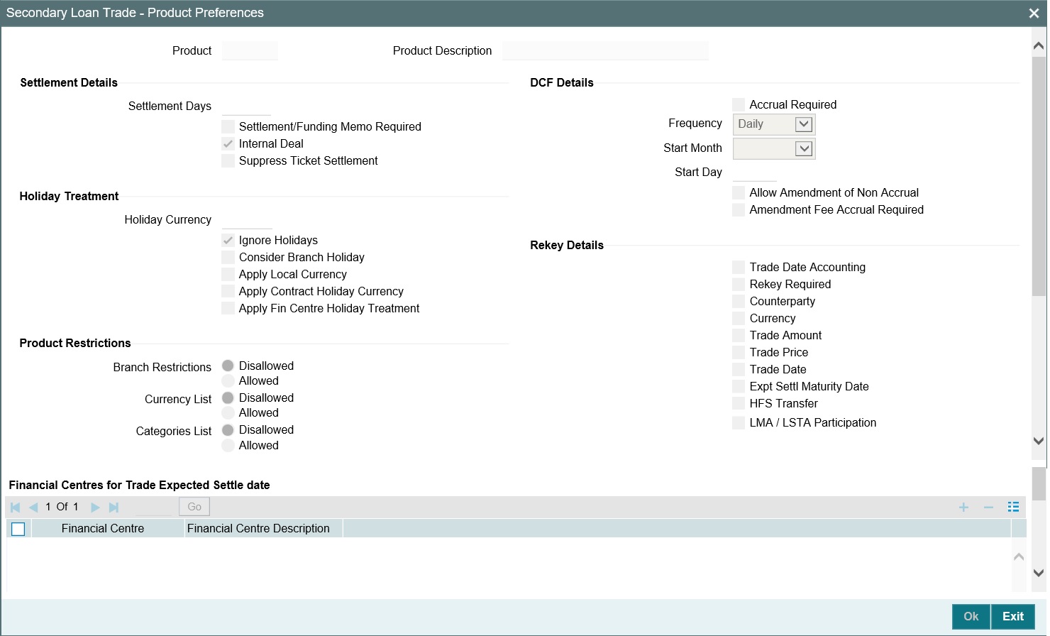 Preferences are the options available for defining the attributes of a product. You can specify the preferences associated with an SLT product in ‘Secondary Loan Trade – Product Preferences’ screen. To invoke this screen, click ‘Preferences’ in the Product Definition screen.