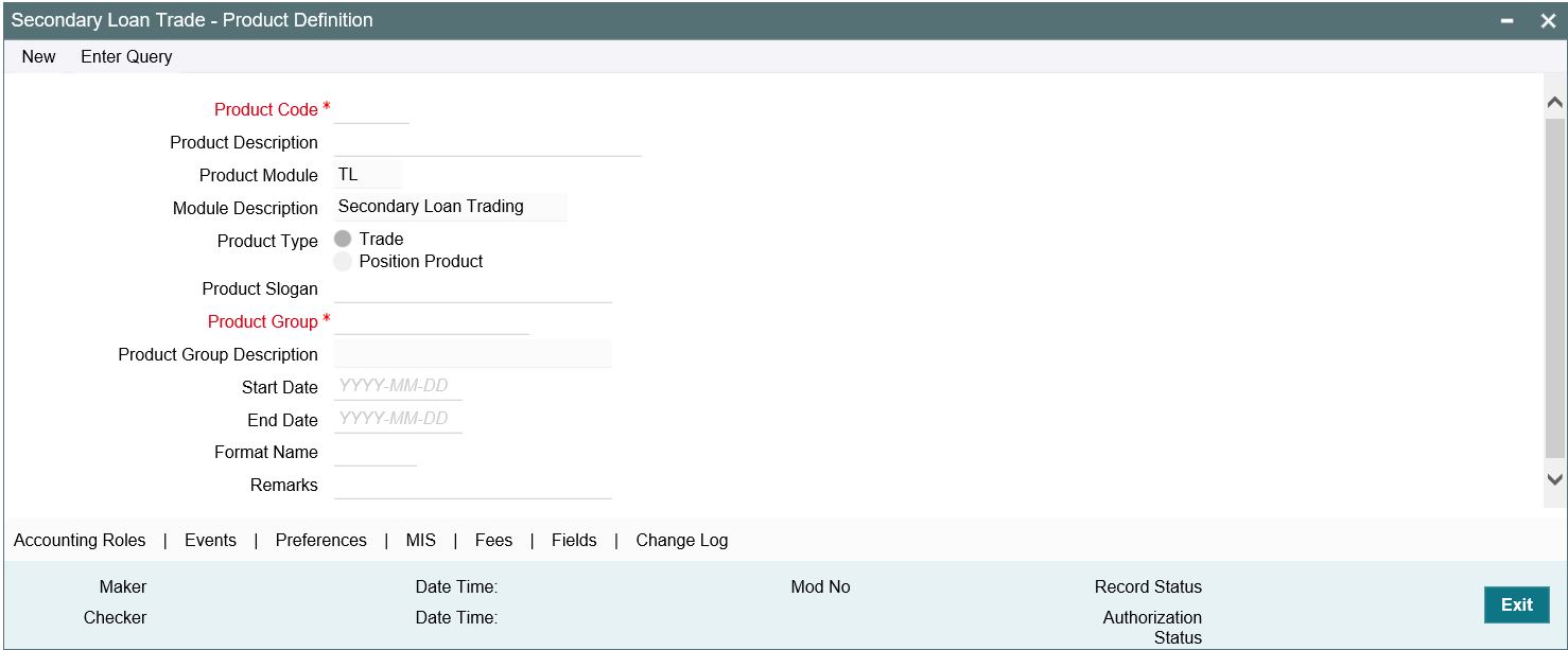 You can invoke the ‘Secondary Loan Trade- Product Definition’ screen by typing ‘TLDPRMNT’ in the field at the top right corner of the Application tool bar and clicking on the adjoining arrow button.