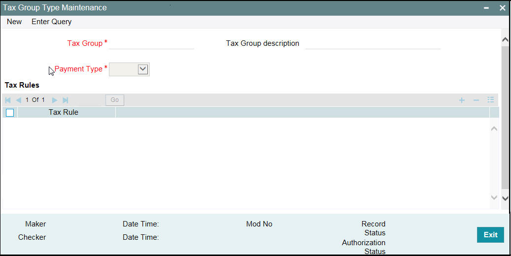 You can use the ‘Tax Group Type Maintenance’ screen to map the tax rule to tax group and payment type.You can perform the following operations in this screen: