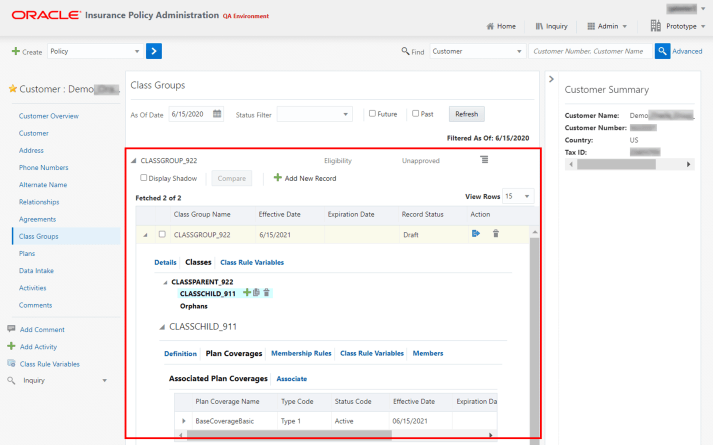 The OIPA page layout is updated to the two-pane layout, now users can view the Summary Pane at the top, it is configurable to display additional information in the context of the entity i.e., Policy, Client, Case, Customer, etc. To hide the Summary pane users can click the ^ minimize icon.