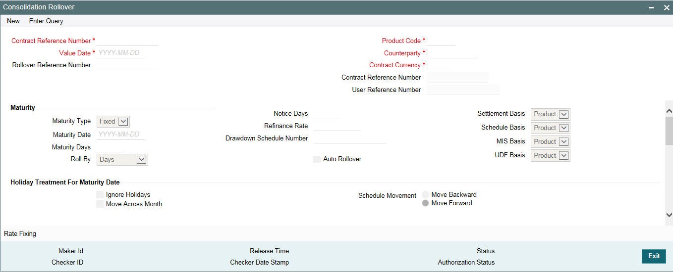 Select the Maturity Date basis for a rolled over contract. Select the option ‘Product’ if you want the tenor of the rolled over contract to be the default tenor maintained for the product. Select the option ‘Contract’ if you want the tenor of the rolled over contract to be the one currently applicable for the contract.