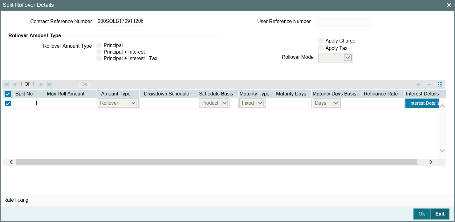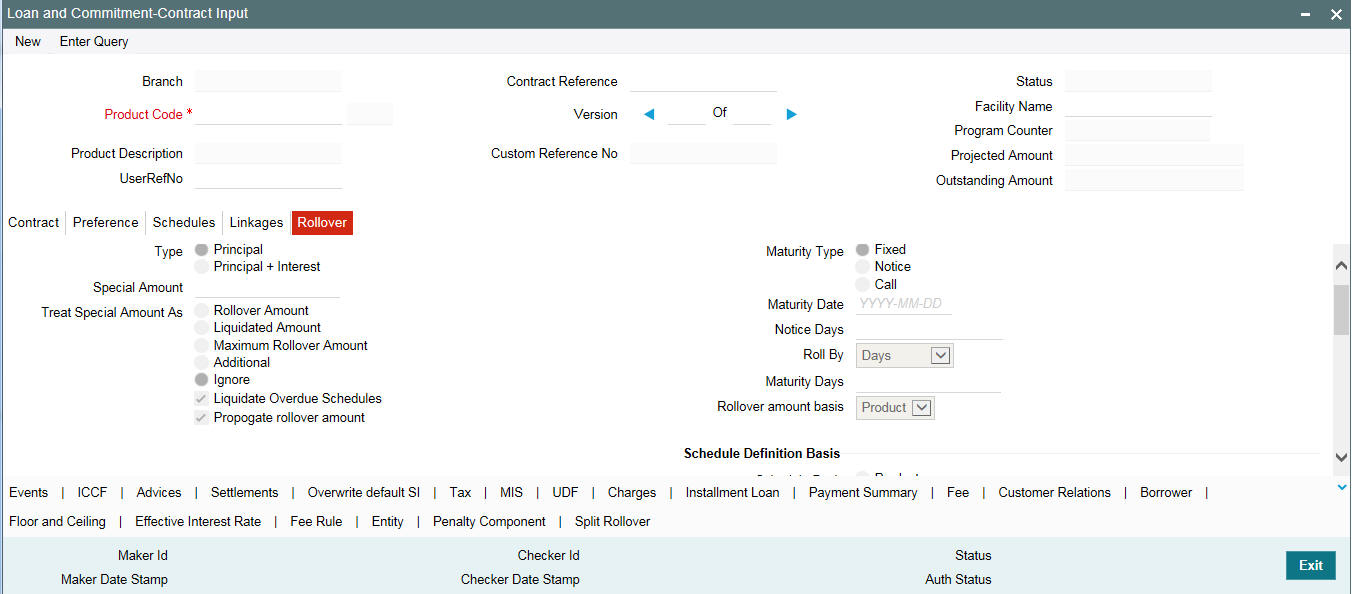 If you have chosen the rollover method as “Normal”, then you must enter the corresponding details for the rollover, in the Rollover tab in the Loan and Commitment- Contract Input screen.
