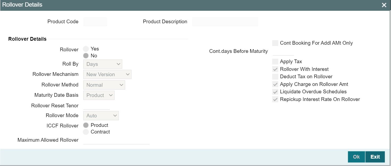 Select the option ‘Yes’ in the section ‘Rollover’ to indicate contracts booked under this product can be rolled over. Select the option ‘No’ to indicate contracts under this product cannot be rolled over. You can, for a contract, change this preference. This can be done while entering a contract in the OL Contract Online screen.