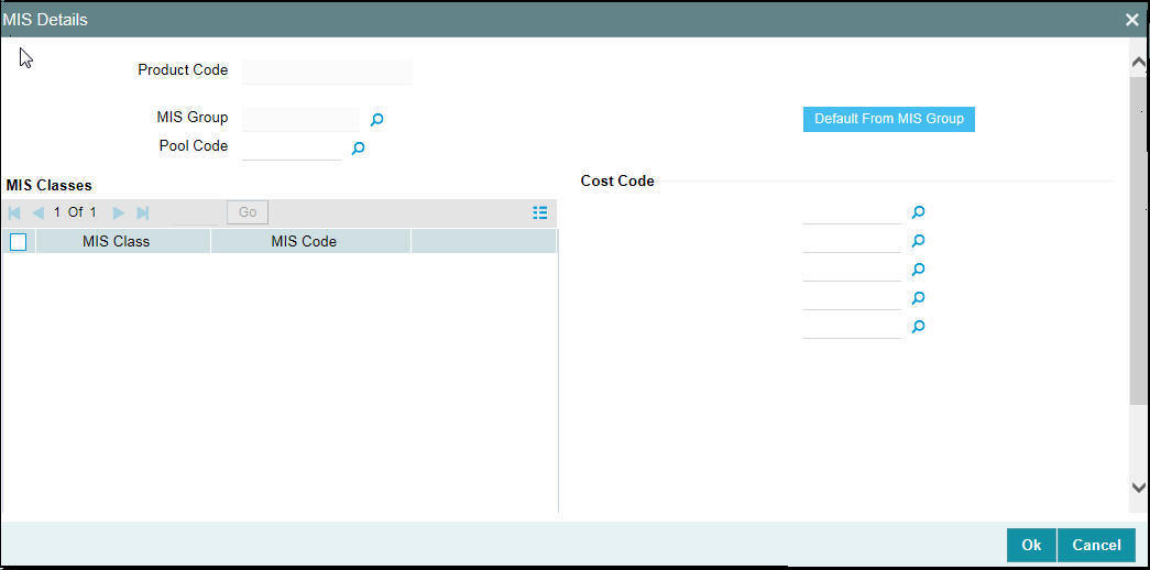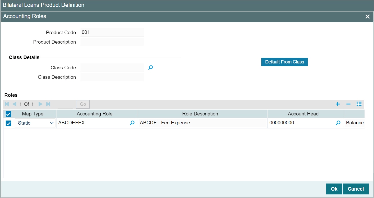 Click Default From Class’ in the ‘Accounting Roles’ screen to associate the product you are maintaining with a class of mapped roles and heads. A list of the classes that you have defined specifically for the module is displayed. Choose a class with the requisite accounting heads and roles mapped.