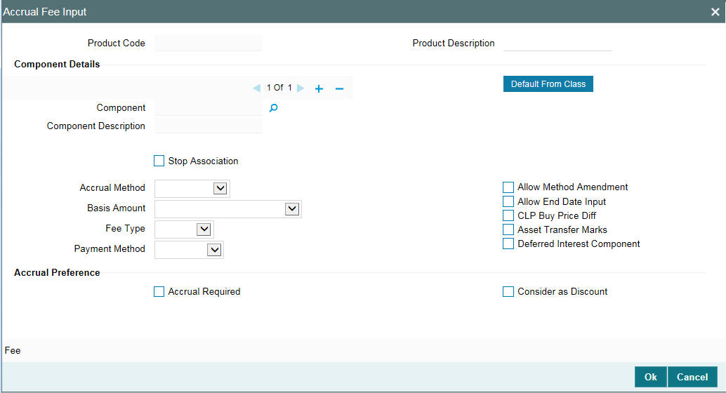 Click ‘Fees’ in the ‘Loans and Commitment Product Definition’ screen of the (for which the fee accrual functionality is applicable) to invoke the ’Fee Details’ screen to link the fee components to a product.