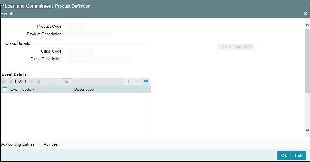 You can invoke the ‘Accounting Roles’ screen by clicking ‘Accounting Roles’ in the ‘Loans and Commitment Product Definition’ screen.