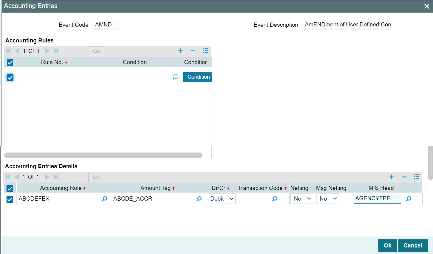 The system ensures that all accounting roles that are applicable for the product and which have been used in the definition of the accounting entries are necessarily linked to an account head. If the mapping is not complete, an error message is displayed when you attempt to save the product.Specifying Events and Accounting Entries