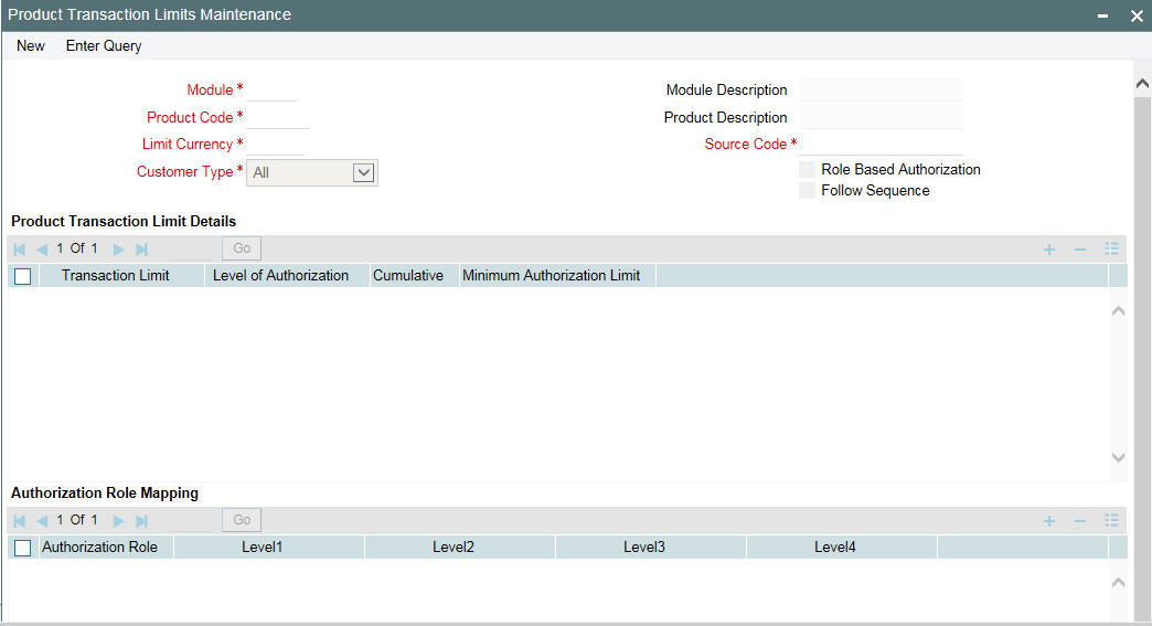 In ‘Product Transaction Limits’ screen, you need to maintain specific combination of fields so that the transactions belonging to this combination can be authorized based on the authorization hierarchy. The specific combination of fields are 'Module', 'Product', 'Limit Currency', 'Customer type' and 'Source Code'.