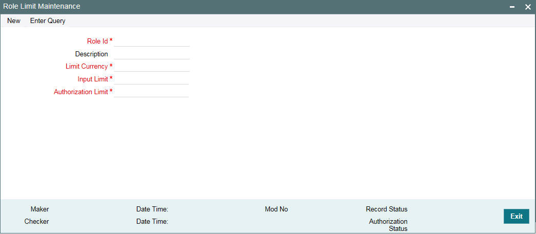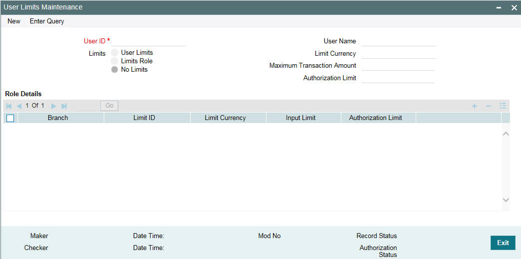 Limits role option is used to maintain branch specific user and authorization limit, specific role templates can be maintained through the ‘Role Limit Maintenance’ (OLDRLLMT) screen.