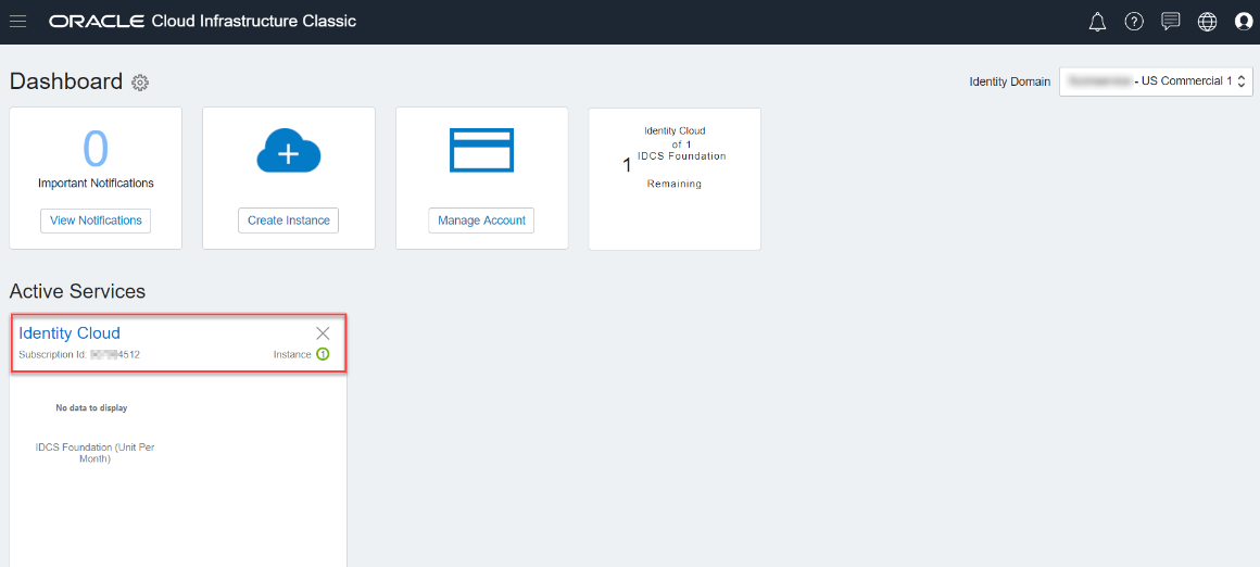 1. In the Oracle Cloud Infrastructure Console Window, under the Active Services, click Identity Cloud.