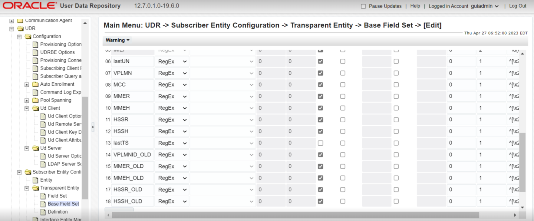 - From the main Menu, navigate to UDR, then select Subscriber Entity Configuration, then select Transparent Entity, select Base Field Set.