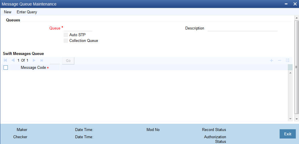 All Incoming SWIFT and Non Swift Messages are routed through a messaging queue. You need to maintain different user queues to which incoming messages are directed. Users with appropriate rights are allowed to access a particular queue. All 798 incoming index messages 770,761,784 are also captured in this screen.